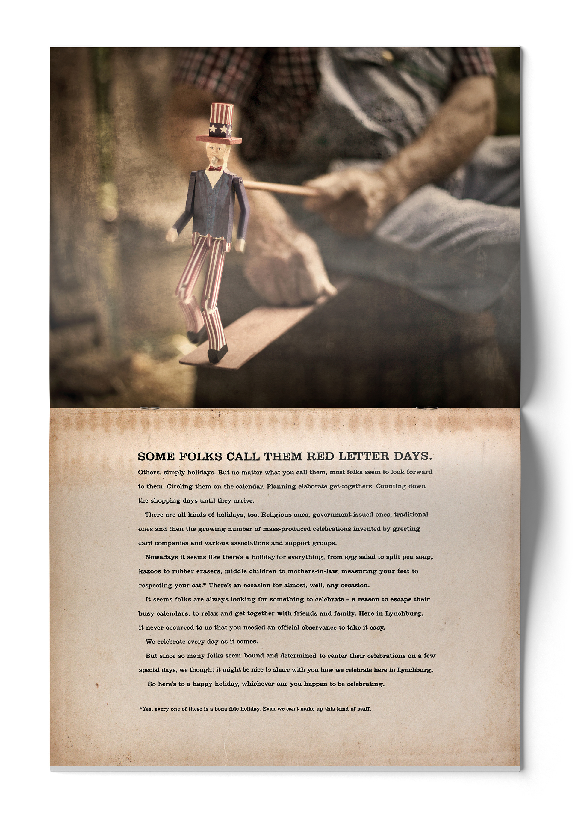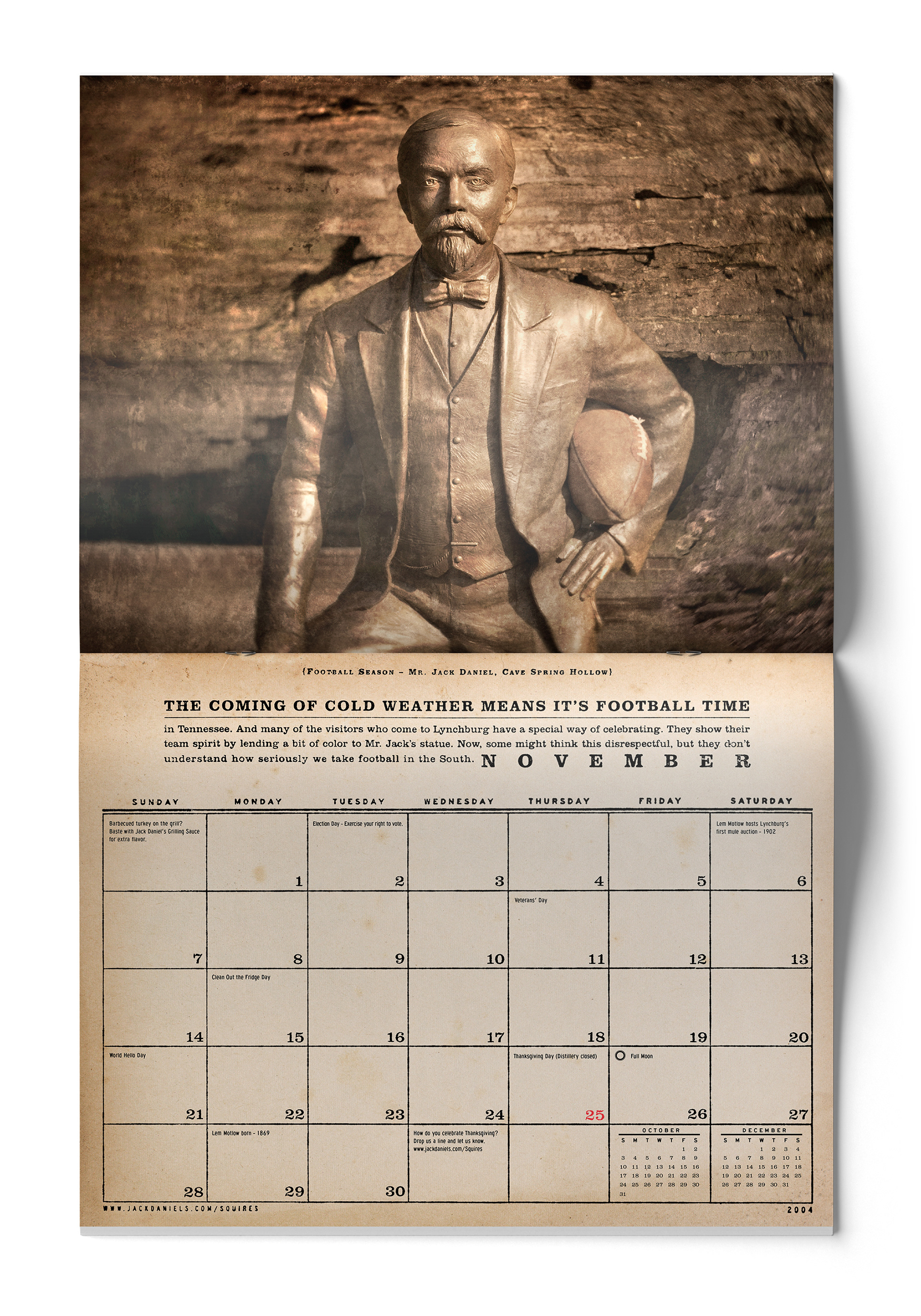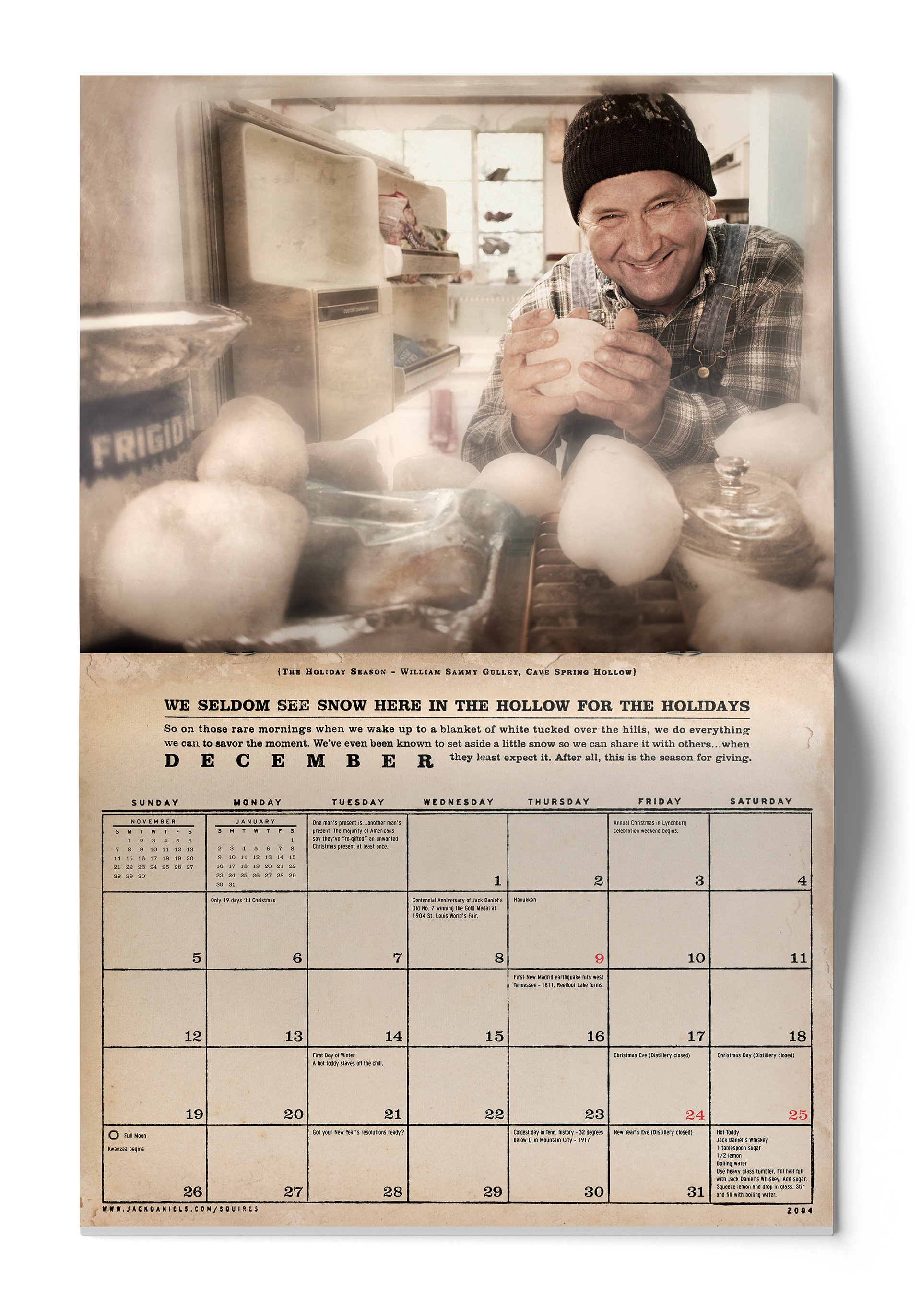 The task was to develop a calendar exclusively for the members of the Tennessee Squires Association. The Squires Association was created in 1956 to foster and grow brand loyalty at a time when Jack Daniel’s whiskey was experiencing a severe shortage and proved extremely difficult to find. This calendar is created each year and sent to each Tennessee Squire worldwide to reinforce the Jack Daniel’s brand values and to extend the ongoing dialog with this very important consumer group. CREDITS: Creative Director and Copywriter: Nelson Eddy; Art Director and Designer: Jeff Porter; Photographer: Mark Tucker; Prop Stylist: Jeff Porter; Agency: DVL.